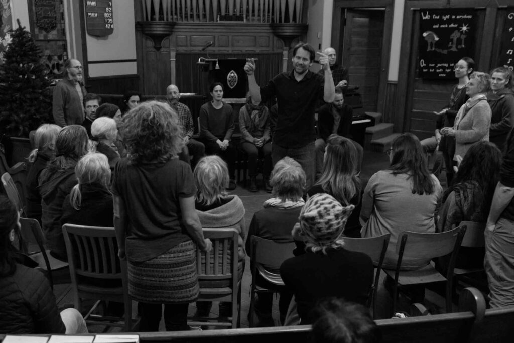 Plusieurs chants magnifiques, touchants, et profonds de notre répertoire se sont développés dans le cadre de communautés spirituelles et religieuses. Bien que la chorale n’a aucune affiliation religieuse spécifique, notre approche à ce répertoire est d’essayer, avec humilité et respect, de toucher à ce qui est commun à l’expérience humaine. Nous pensons que la musique, tout spécialement les chants sacrés collectifs, sont l’un des moyens les plus puissants pour expérimenter ce qui nous relie.